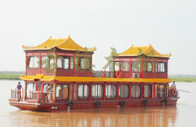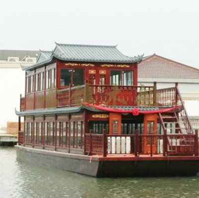 畫舫船就是裝飾古典華麗的游船,是"中國風(fēng)"的仿古游船,結(jié)合古典園林建筑,體現(xiàn)了中華文明的古典藝術(shù).畫舫船豪華而又古典,船上的建筑按照中國古代建筑里的亭臺樓閣,建筑工藝之復(fù)雜,要求之嚴(yán)格,仿古畫舫游船的特點(diǎn)飛檐翹角、玲瓏精致的四角亭子逐漸成形,赫然立于船頭,美人靠、盤龍柱子、彩畫……龍柱上的浮雕盤龍和祥云一層扣著一層,層層錯(cuò)落有致,雕刻精細(xì)到盤龍身上的每一個(gè)鱗片都細(xì)細(xì)可數(shù),古代皇家標(biāo)志性元素,在畫舫船上體現(xiàn)的淋漓盡致。除了雕刻、花窗,整條船還有一個(gè)看點(diǎn),那就是弧線優(yōu)美、高高翹起的船尾。游船并不大,長約10米、寬3米,但是整體看起來堪稱一件藝術(shù)品。船尾的雕花欄桿與船艙、船頭的雕刻遙相呼應(yīng),船身四周貼著浮雕祥云,給整條船增添了富貴、華麗的氣質(zhì)。
